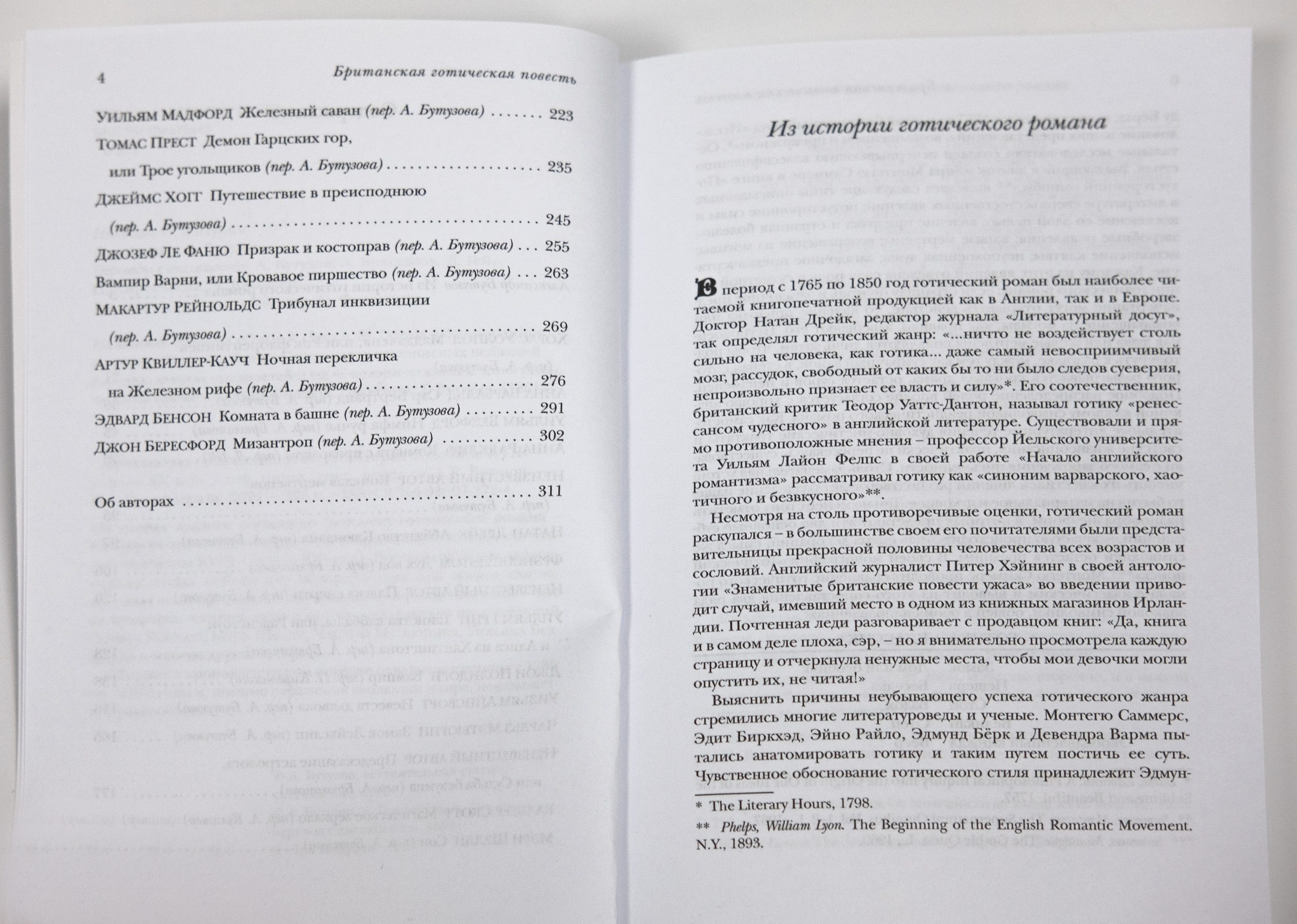 Авторы, представленные в сборнике: Хорас Уолпол, Анна Барбальд, Уильям Бекфорд, Анна Радклиф, Натан Дрейк, Фрэнсис Лэтом, Уильям Грин, Джон Полидори, Уильям Айнсворт, Чарльз Мэтьюрин, Вальтер Скотт, Мэри Шелли, Уильям Мадфорд, Томас Прест, Джеймс Хогг, Джозеф Ле Фаню, Макартур Рейнольдс, Артур Квиллер-Кауч, Эдвард Бенсон, Джон Бересфорд